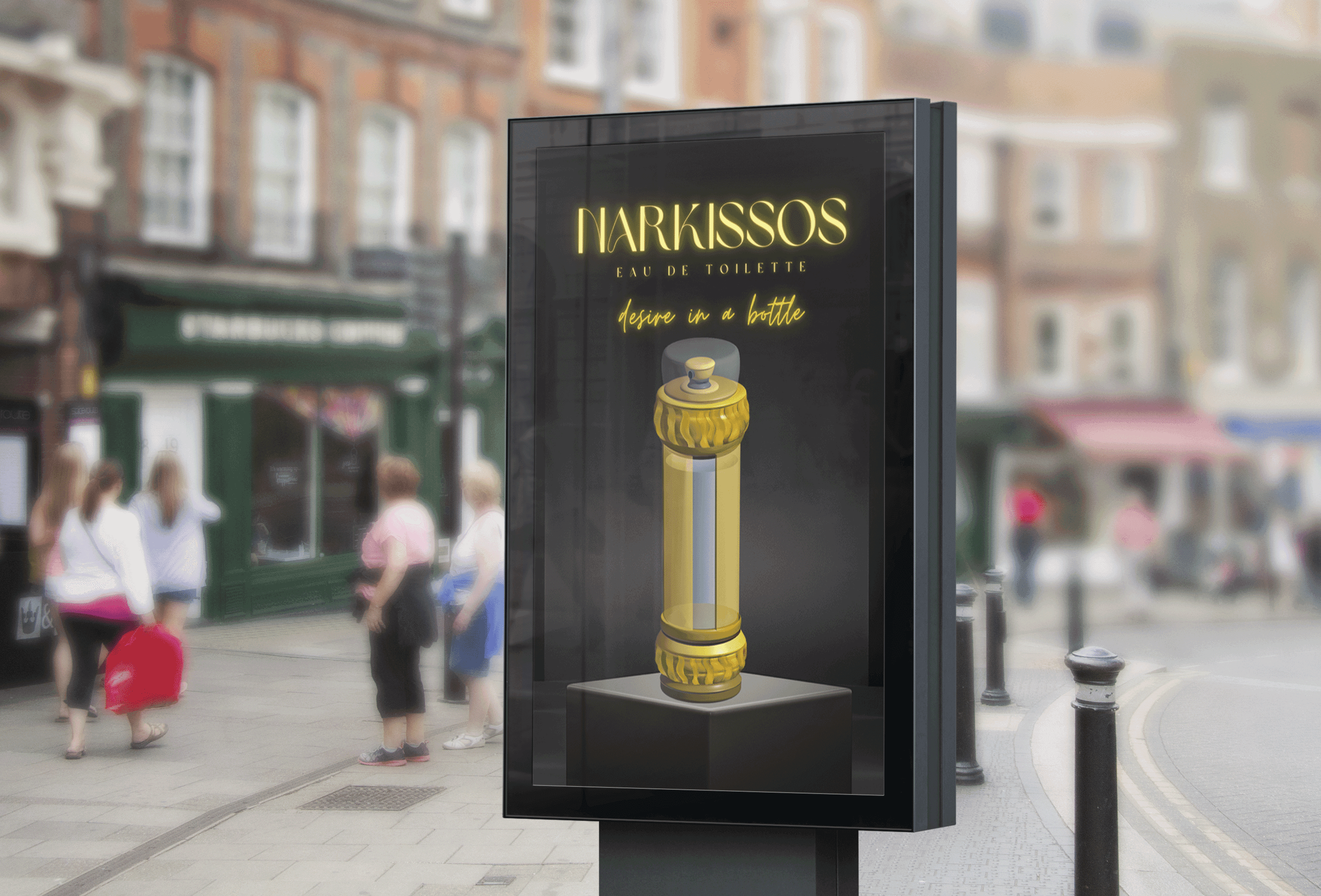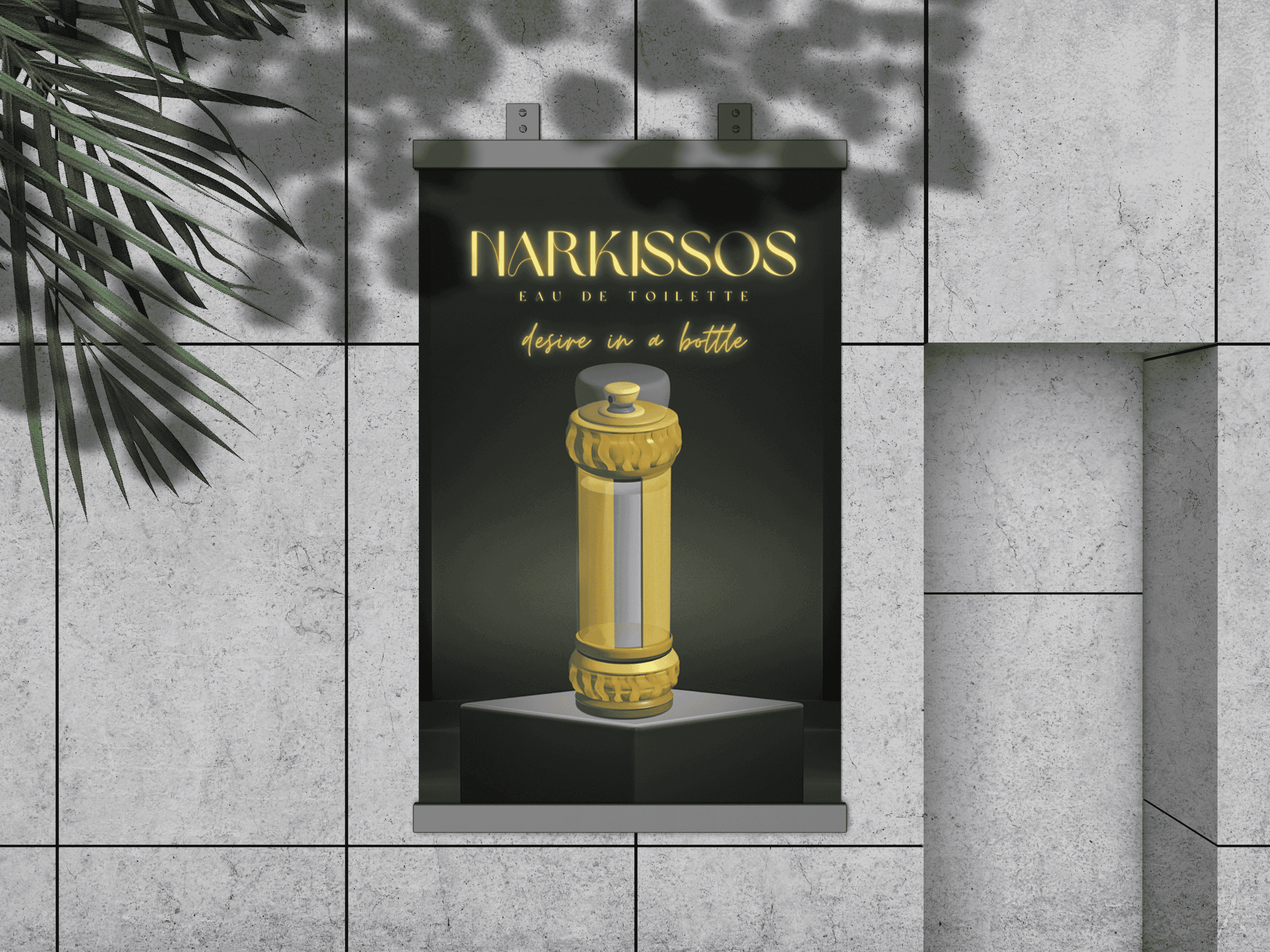 I’ve designed a personal perfume brand and packaging called Narkissos. In short, an eau de toilette is a lightly scented perfume, also referred to as aromatic waters and has a high alcohol content. It is usually applied directly to the skin after bathing or shaving. Narkissos, the perfume brand name, is inspired by the Greek mythology behind the daffodil flower, where Narcissus fell and drowned in a pool of water after gazing upon his reflection of himself because it was the only thing he desired, hence a white and yellow flower sprouting in his name.