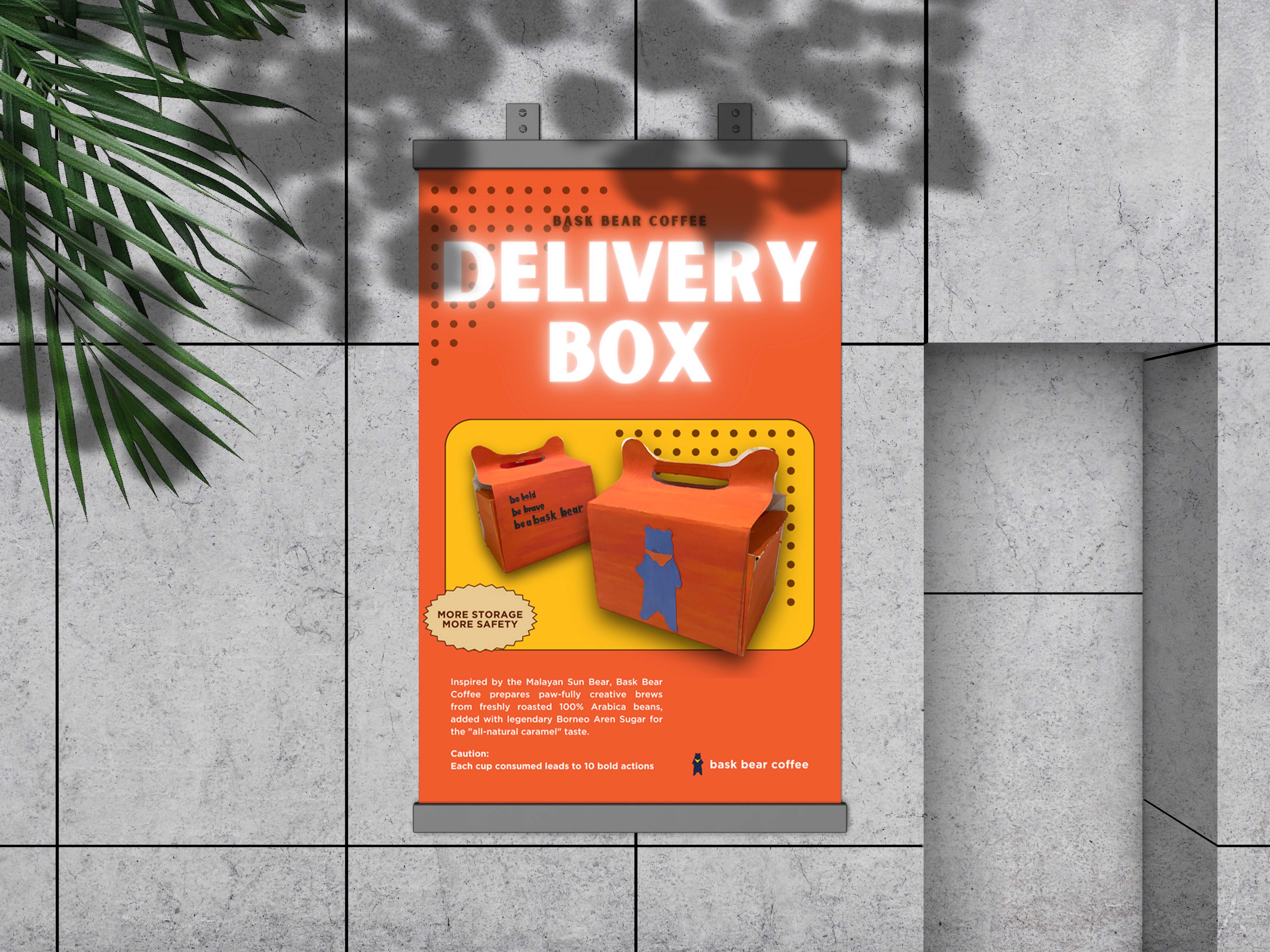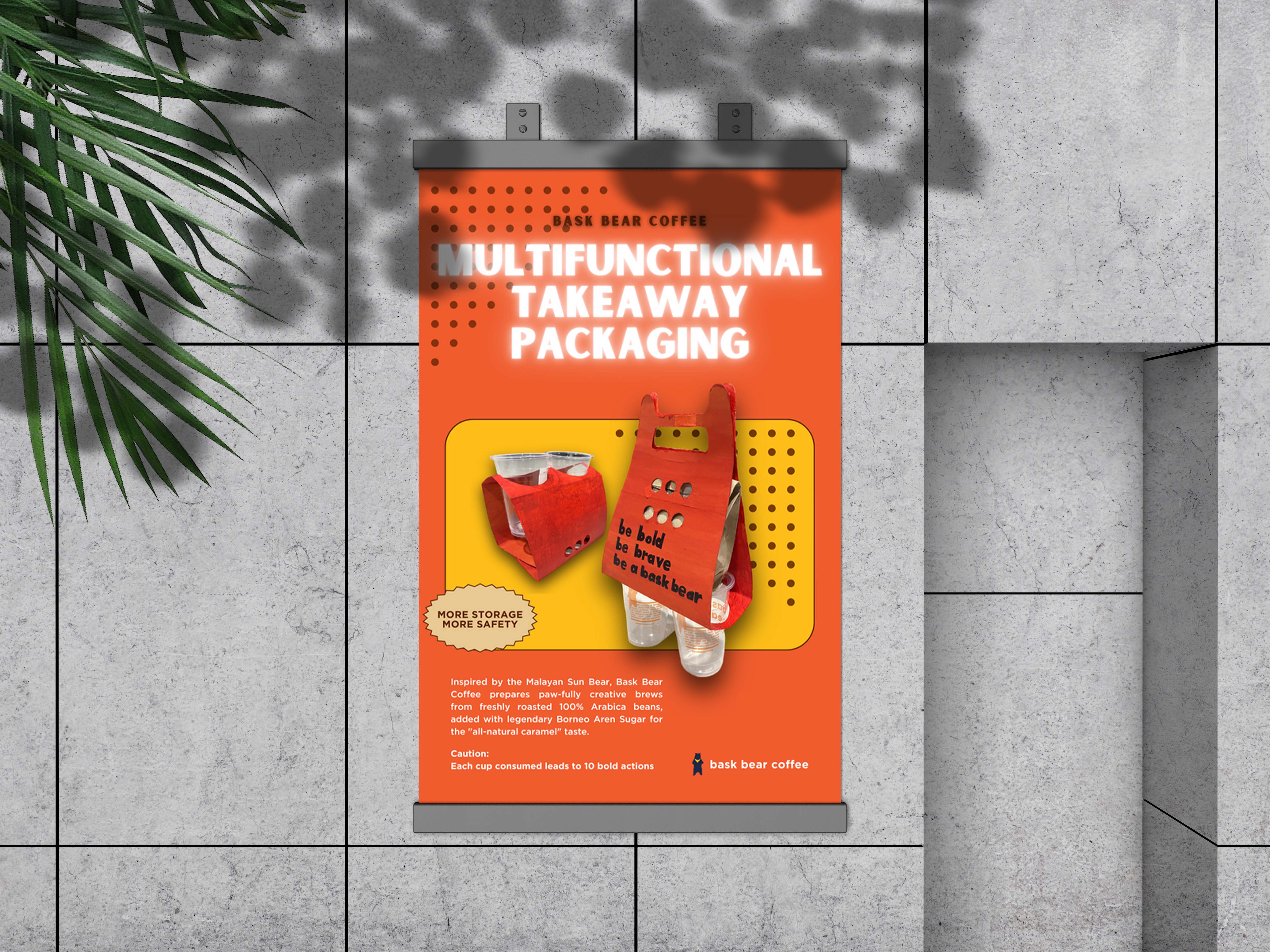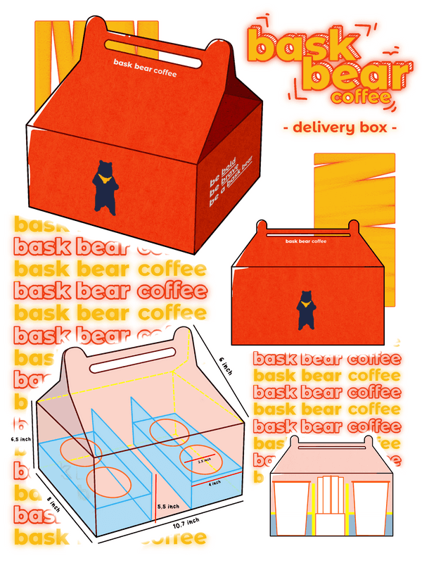 Bask Bear Coffee is our brand of choice because their existing packaging for multiple food and drink items only comes in a paper bag in different sizes. Such packaging is easy to carry for short distances but it is not the most secure design for food delivery services like FoodPanda and GrabFood. Therefore, we came up with designing a takeaway packaging design for set meals in a form of a compact and secure box.